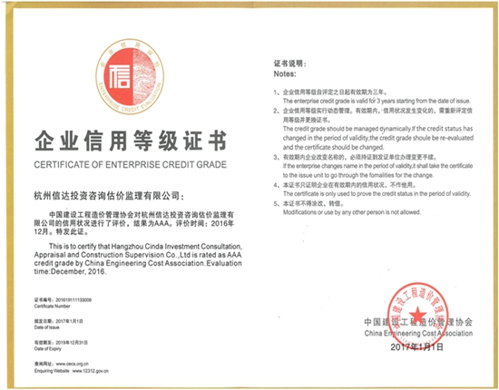 中國(guó)建設(shè)工程造價(jià)管理協(xié)會(huì)企業(yè)信用等級(jí)AAA級(jí)(2016.12 有效期三年)